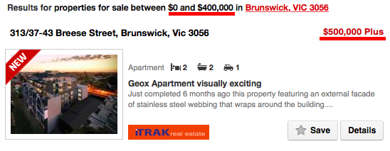 Seriously – if you’re going to show properties that are over the “Max Price” selection, then why have it as a query filter. Actually this goes for all parameters – make sure all the results actually fall within the parameters.